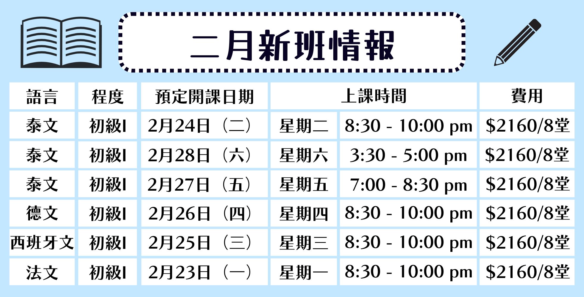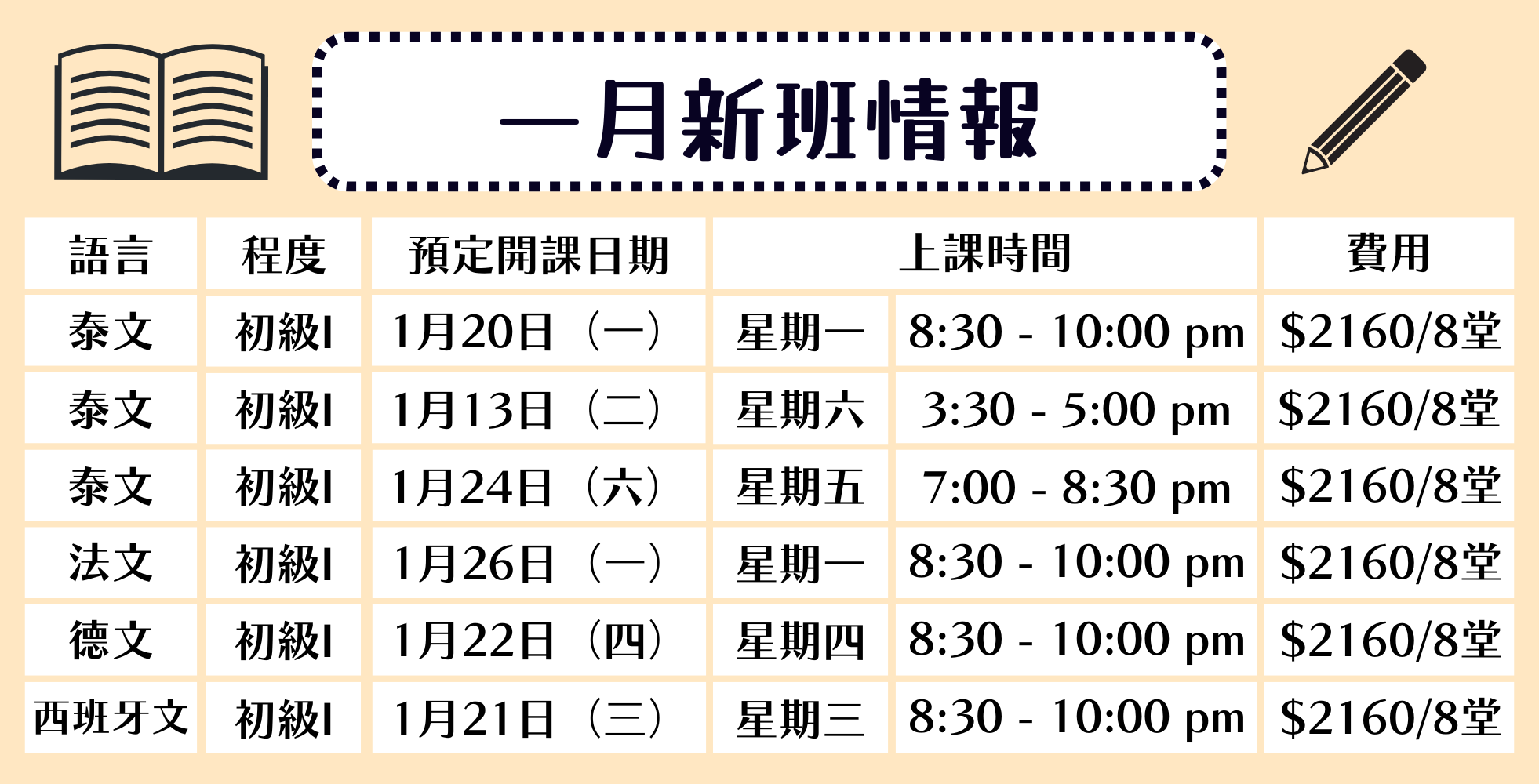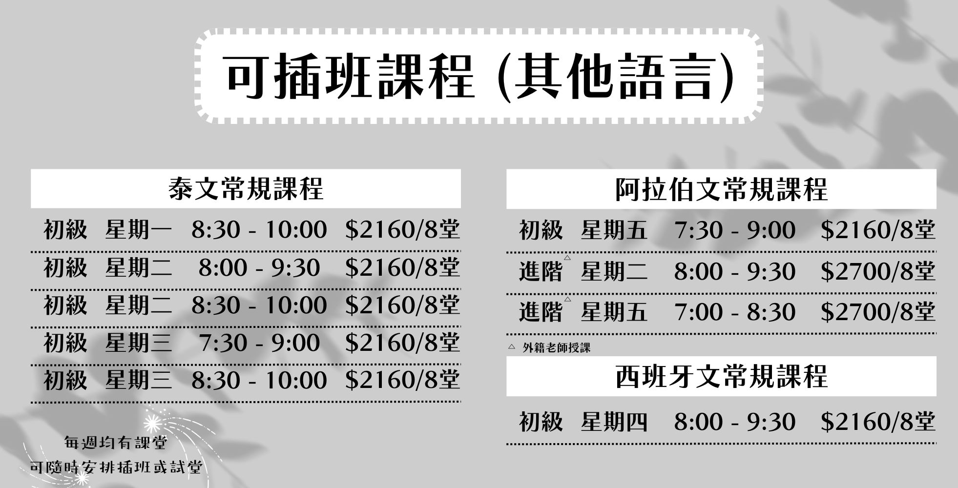 ‧ 西班牙文課程 ‧ 法文課程 ‧ 泰文課程