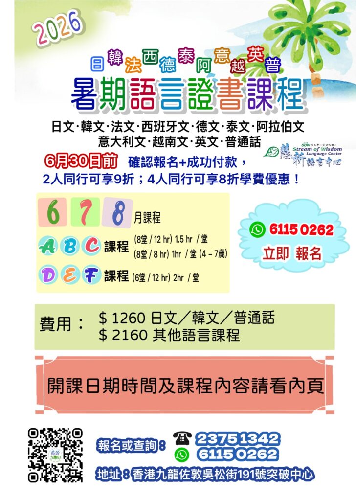 2026香港暑期語言證書課程|多國語言暑期班現正招生